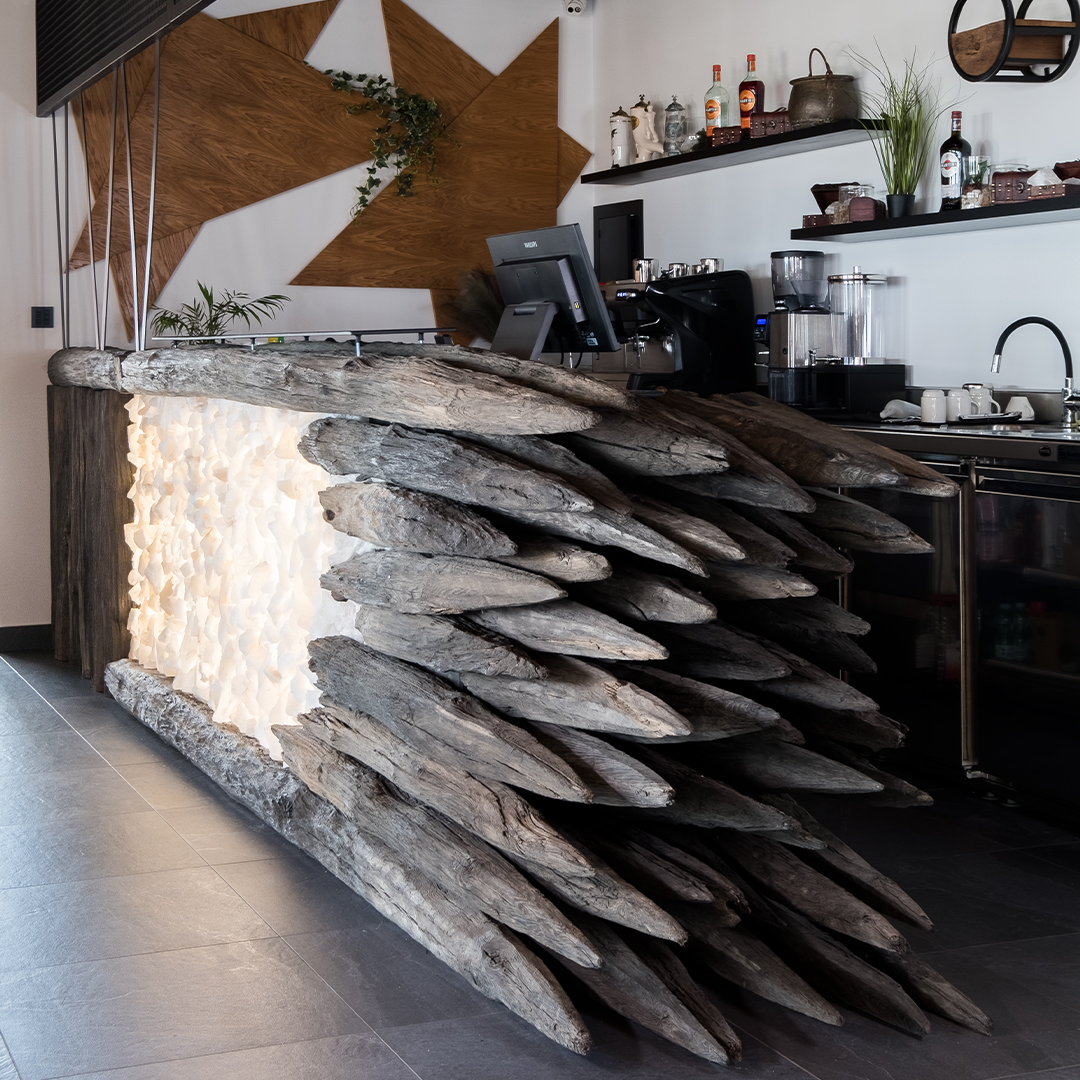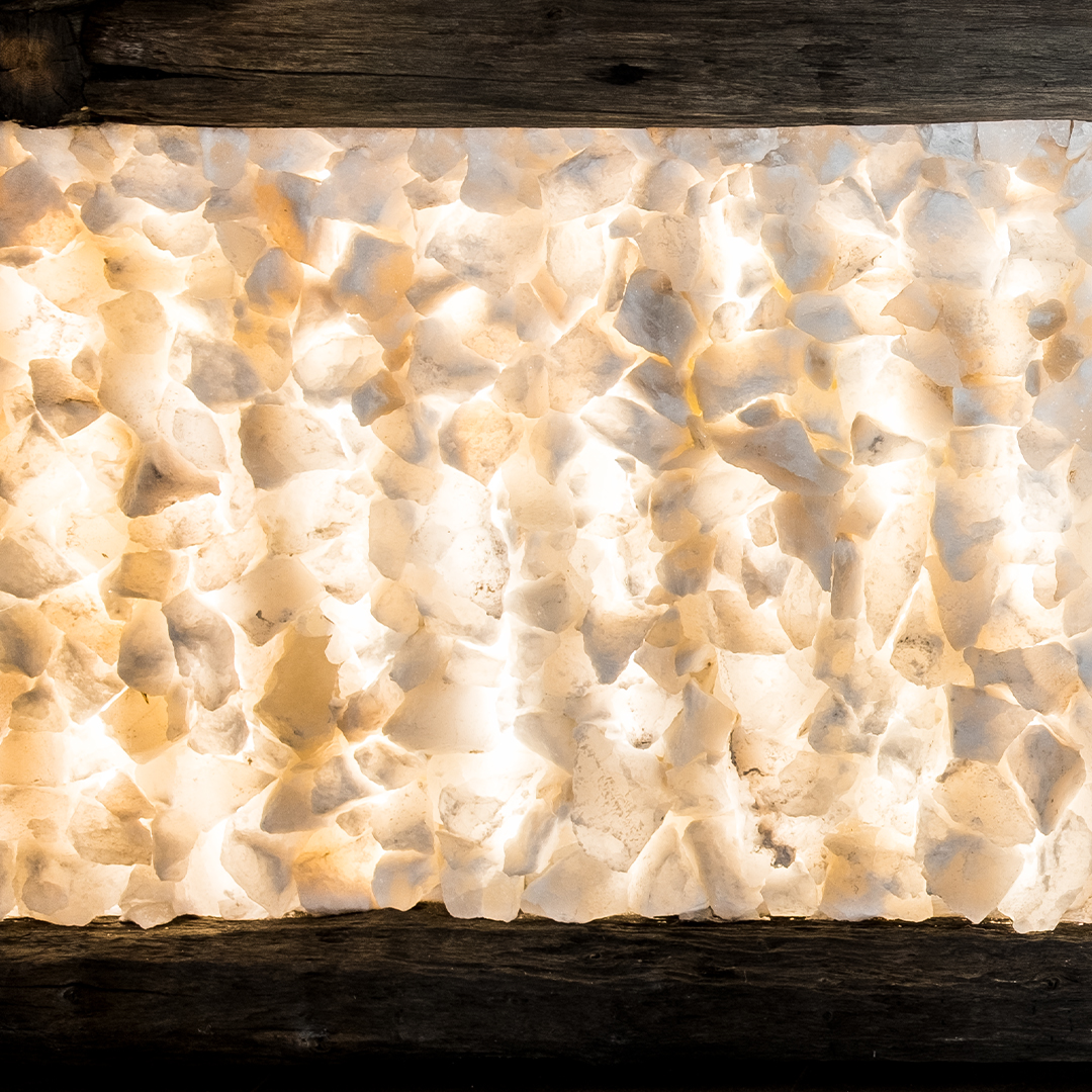 Połączenie surowych, wiekowych pali z delikatnym światłem przebijającym przez panele z soli kamiennej tworzy niezwykły efekt – ciepły, a zarazem nowoczesny. Kontrast pomiędzy organiczną fakturą drewna a subtelnym blaskiem soli symbolizuje spotkanie natury z designem, przeszłości z teraźniejszością.