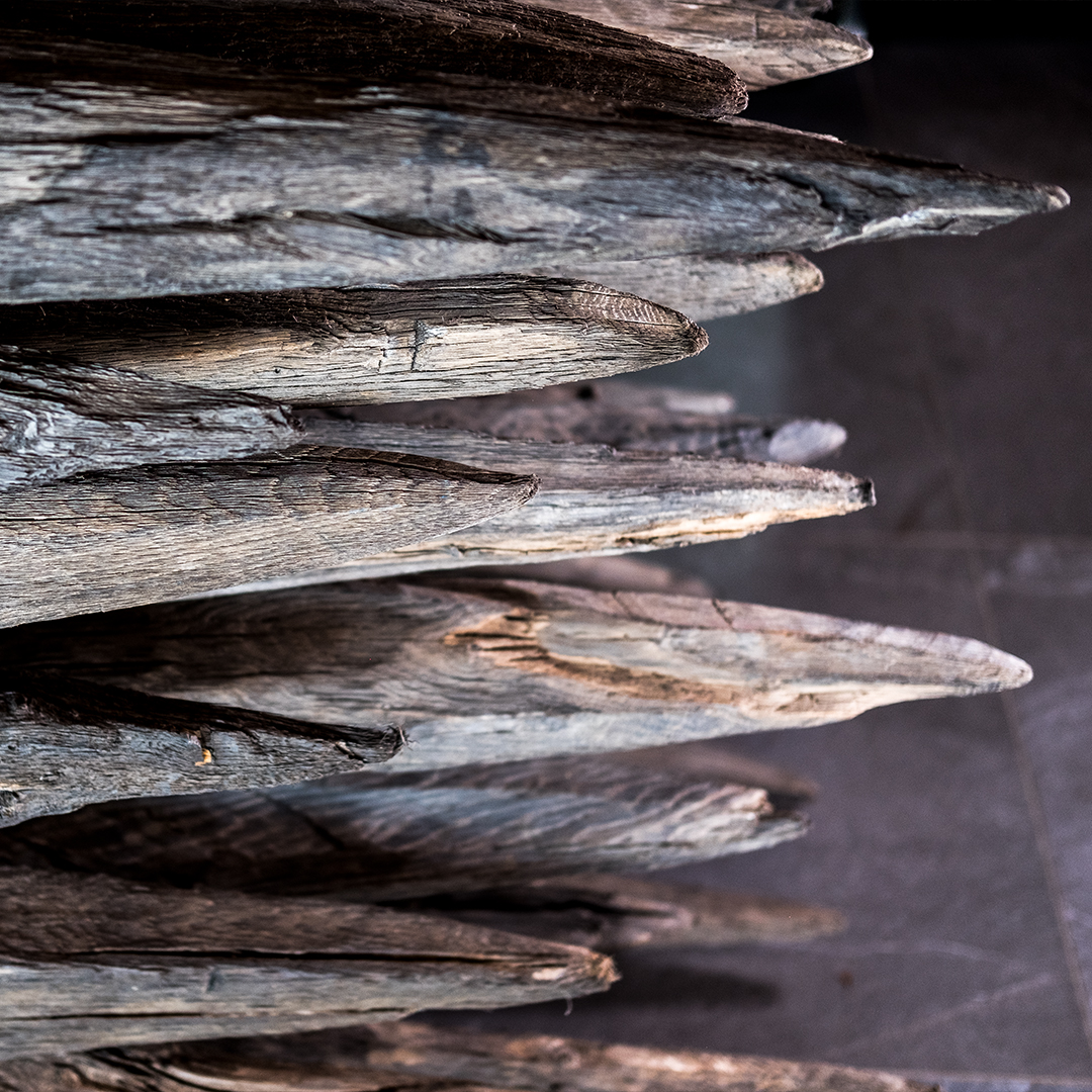 Do jej stworzenia wykorzystaliśmy autentyczne dębowe pale z XV wieku, które niegdyś stanowiły fundamenty starej osady. Przez stulecia drewno spoczywało w ziemi, gdzie – chronione przed powietrzem – nabrało wyjątkowej struktury, głębokiej barwy i niepowtarzalnego charakteru. Ten naturalny proces uczynił je materiałem o ogromnej wartości, zarówno historycznej, jak i estetycznej.